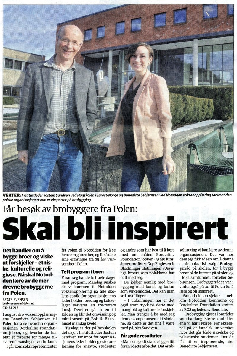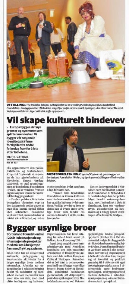 Partnerem strategicznym projektu w mieście Notodden, położonym w połudnowo-zachodniej Norwegii, jest Urząd Miejski. W ramach Centrum Kształcenia Dorosłych, instytucji administrowanej przez urząd miejski, powstało stowarzyszenie Brobyggerrådet - Budowniczy Mostów. Jest to grupa studentów realizująca idee programu "Opowieści o Współistnieniu". Większość uczniów Centrum to uchodźcy, realizują kurs języka norweskiego, niejednokrotnie uzupełniają swoją wiedzę o nauki podstawowe, pisania i czytania. Drugim miejscem prezentacji i spotkań był Art and Design College, gdzie większość studentów to Norwegowie zgłębiający nowe kierunki sztuki wizualnej i sztuki użytkowej. W obu instytucjach Krzysztof Czyżewski wygłosił wykład "Kultura i Solidarność", członkowie zespołu Pogranicza przeprowadzili warsztaty przedstawiające praktykę pracy artystycznej i edukacyjnej w środowiskach wielokulturowych.
