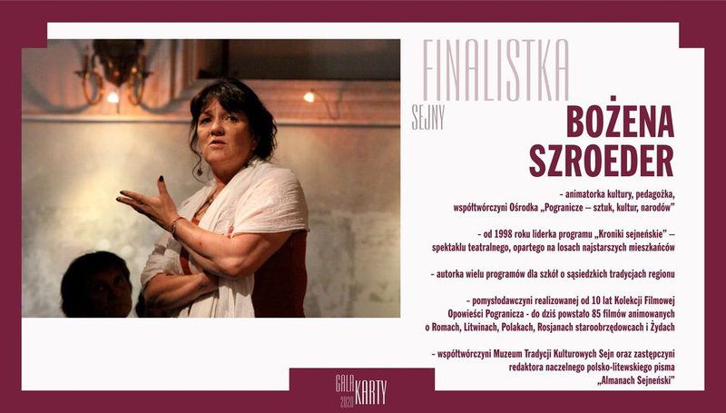 Bożena Szroeder jest animatorką kultury, pedagożką, współtwórczynią Ośrodek „Pogranicze – sztuk, kultur, narodów”. Od 1998 roku liderka programu „Kroniki sejneńskie” – spektaklu teatralnego, opartego na losach najstarszych mieszkańców. Autorką wielu programów dla szkół o sąsiedzkich tradycjach regionu Pomysłodawczynią realizowanej od 10 lat Kolekcji Filmowej Opowieści Pogranicza - do dziś powstało 85 filmów animowanych o Romach, Litwinach, Polakach, Rosjanach staroobrzędowcach i Żydach. Współtwórczynią Muzeum Tradycji Kulturowych Sejn oraz zastępczynią redaktora naczelnego polsko-litewskiego pisma „Almanach Sejneński”.