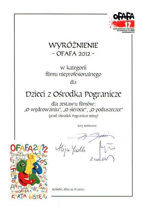 Jury 17. Ogólnopolskiego Festiwalu Autorskich Filmów Animowanych OFAFA 2012 w składzie: Witold Giersz (przewodniczący Jury), Adam Garbicz (sekretarz), Alicja Jodko, Zbigniew Kotecki, Bartek Kulas po obejrzeniu w dniach 22-23 marca 2012 roku 65 filmów zakwalifikowanych do konkursu na posiedzeniu w dniu 23 marca 2012 roku postanowiło przyznać następujące nagrody: