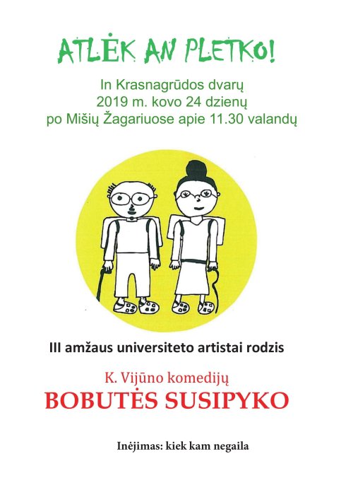 Aktorzy pokażą komedię Kazisa Vijūnasa "Bobutės susipyko" - „Babki się pokłóciły” w adaptacji i reżyserii Ruty Burdyn. Sztuka opowiada o tym jak plotka może łatwo skłócić ludzi i zniszczyć wieloletnią przyjaźń sąsiadek, które w wyniku zdarzeń trafiają do więziennej celi i dopiero tam „odzyskują rozum”.