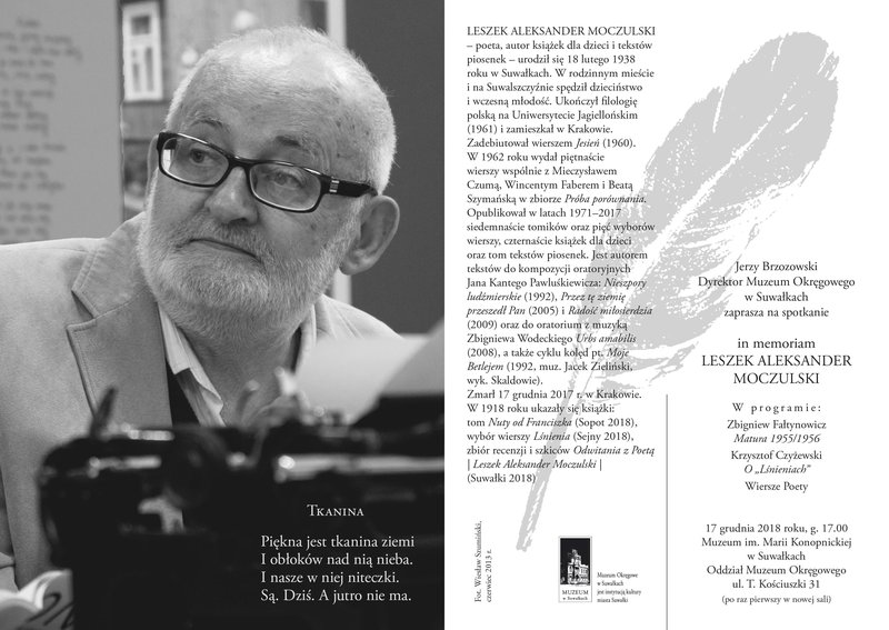 Jerzy Brzozowski Dyrektor Muzeum Okręgowego w Suwałkach zaprasza na spotkanie poświęcone Leszkowi Aleksandrowi Moczulskiemu w rocznicę śmierci Poety. W programie: Zbigniew Fałtynowicz Matura 1955/1956; Krzysztof Czyżewski O "Lśnieniach"; Wiersze Poety.