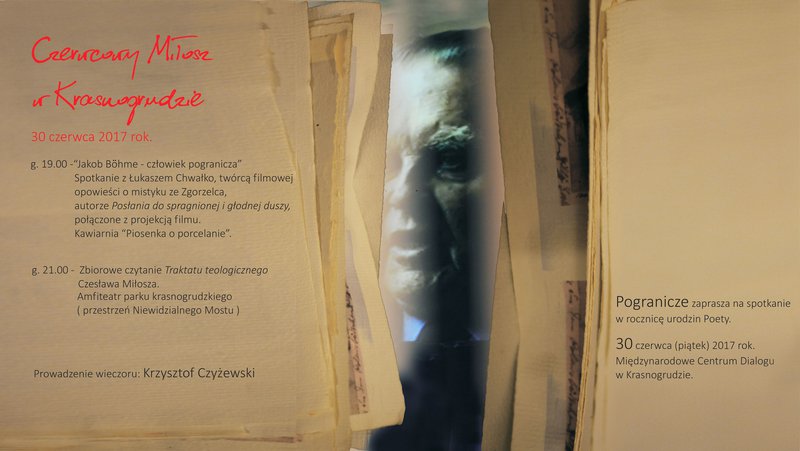 Zbiorowe czytanie "Traktatu teologicznego" Czesława Miłosza w Krasnogrudzie, w rocznicę urodzin Poety, z bibliofilskiego, polsko-litewskiego wydania poematu (przekład litewski Almis Grybauskas). Po zmierzchu w przestrzeniach niewidzialnego mostu część pierwszą traktatu czytał Antoni Miłosz. Wcześniej, w kawiarni "Piosenka o porcelanie" odbył się pokaz filmu o Jakubie Böhme, którego autor przywołuje w poemacie. 30. VI. 2017. Janina Osewska