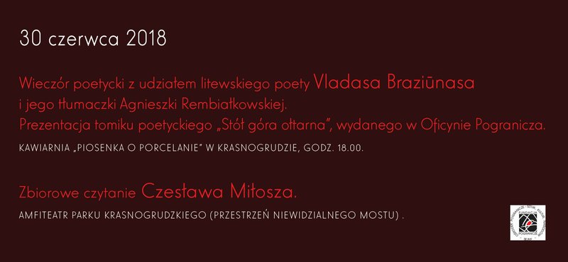 Wieczór poetycki z udziałem litewskiego poety Vladasa Braziūnasa i jego tłumaczki Agnieszki Rembiałkowskiej. Prezentacja tomiku poetyckiego "Stół góra ołatarna", wydanego w Oficynie Pogranicza. Kawiarnia literacka "Piosenka o Porcelanie" w Krasnogrudzie, godz. 18.00.